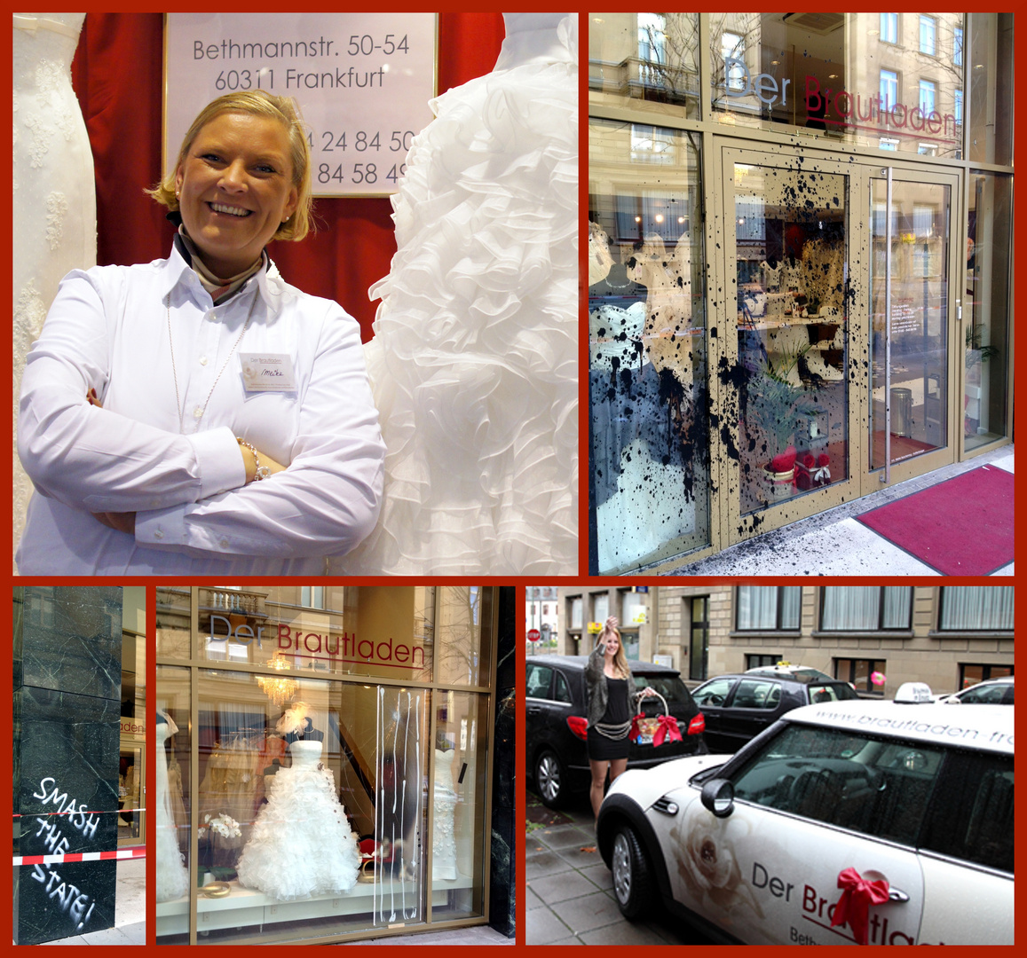 März 2012 erleben wie ihr brautladen in frankfurt am main von demonstranten der occupy bewegung mit farbbeuteln und schmierereien verwüstet wurde.